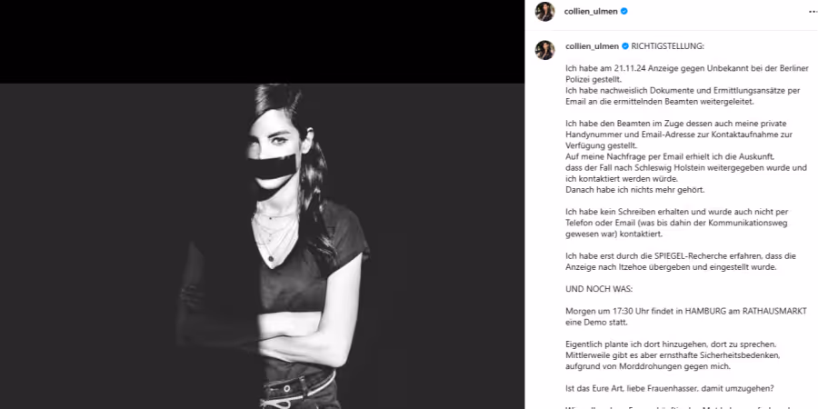 Mittlerweile gibt es aber ernsthafte Sicherheitsbedenken, aufgrund von Morddrohungen gegen mich», schreibt sie in einem emotionalen Post auf Instagram. «Wie sollen denn Frauen künftig den Mut haben, aufzubegehren, wenn das Eure Antwort ist? man so mundtot gemacht wird?»
