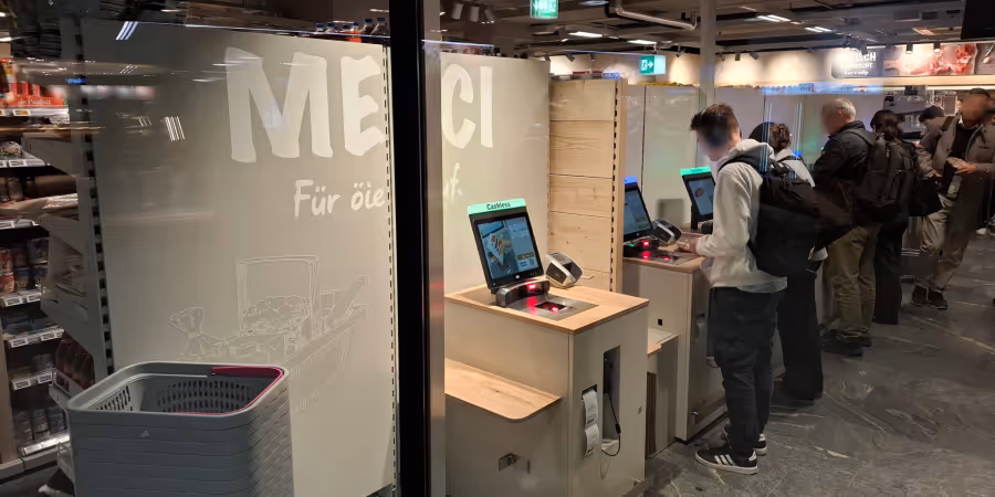 Um den Andrang zu bewältigen, stehen neben mehreren bedienten Kassen auch zahlreiche Self-Checkout-Stationen bereit. Doch ein Detail trübt das Konzept.