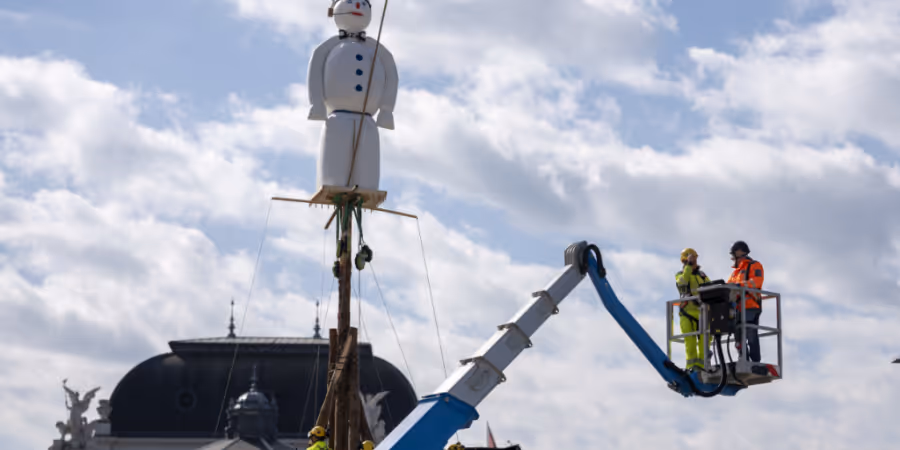 Unter dem Schneemann auf dem Sechseläutenplatz wird der grosse Holzstoss errichtet. Ab 18 Uhr sollen dann die Flammen lodern. Der Böögg trägt eine Fliege mit Steinbockmotiv, die an den Gastkanton Graubünden erinnert.