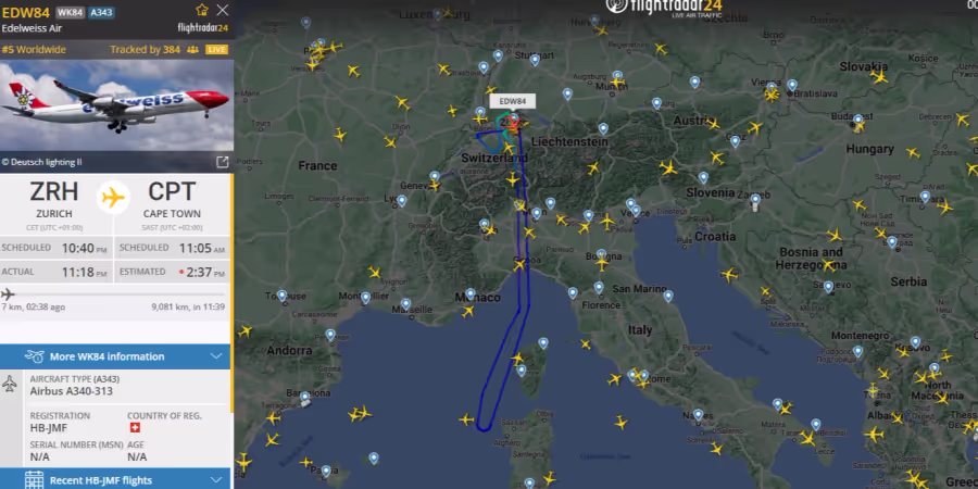 In der Nacht auf Montag musste ein Flugzeug von Edelweiss auf dem Weg in die südafrikanische Stadt Kapstadt umkehren. Wie auf «Flightradar24» zu sehen ist, musste die Maschine auf der Höhe von Sardinien wieder Kurs auf Zürich nehmen.