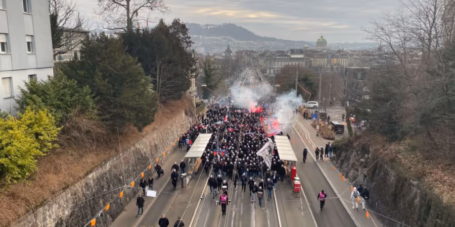 Mehrere hundert Fussballfans aus Lyon ziehen durch die Stadt Bern