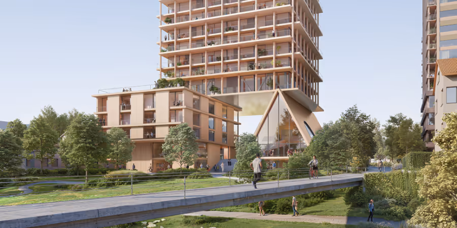 Das geplante Hochhaus soll gleich neben dem 100 Meter hohen Holz-Wohnturm von Christ & Gantenbein stehen. Dieser Bau gehört zur Quartierplanung Birsstegweg, die bereits an der Gemeindeversammlung im Dezember 2023 genehmigt wurde.