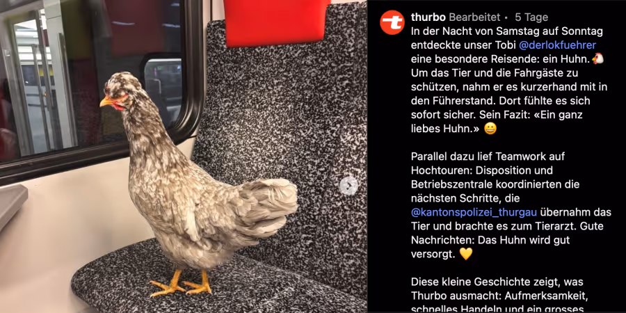 Ein Huhn reiste in einem Thurbo-Zug mit. Der Lokführer nahm das Tier in den Führerstand, bevor es sicher der Polizei und der Halterin übergeben werden konnte.