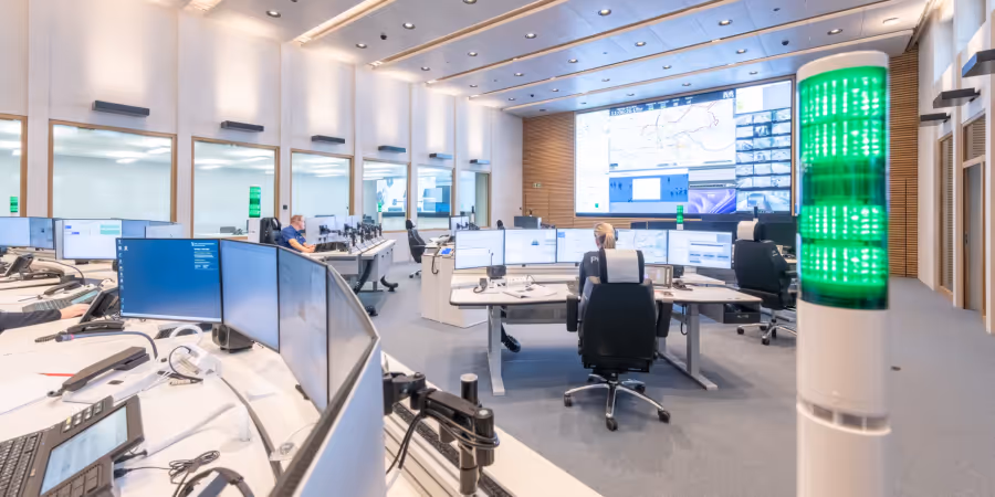 In der neuen Einsatzzentrale stehen neun Disponenten-Arbeitsplätze zur Verfügung. Herzstück der neuen Zentrale ist eine Riesenanzeige mit aktuellen Lageinformationen für die Polizistinnen und Polizisten. Demnächst wird zudem die Verkehrsleitzentrale der Verkehrspolizei in die Einsatzzentrale Spiegelhof integriert.