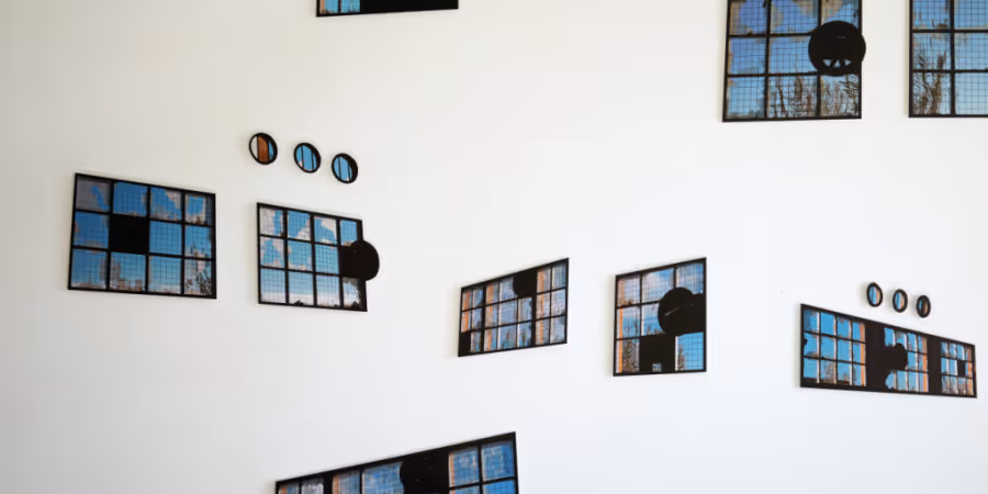 Eine weitere Arbeit besteht aus Fotos von Fenstern einer ehemaligen Fabrik aus verschiedenen Blickwinkeln. Diese fügt Hofer an einer Wand neu zusammen, wobei neue Räume zu entstehen scheinen.