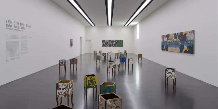 Die Ausstellung trägt den Titel «Mosaïque, présence, absence». Sie beinhaltet nicht nur Gemälde, sondern auch Arbeiten die Malerei und Skulptur verbinden. Für diese Werkserie schuf Bisso eine Reihe von Bildern, die jeweils auf dem vorangehenden basieren. In diesem Spiel mit Original und Kopie zeigt sich gemäss Mitteilung des Kunstmuseums, wie Motive und Symbole zirkulieren, wiederkehren und neue Aktualität erlangen.