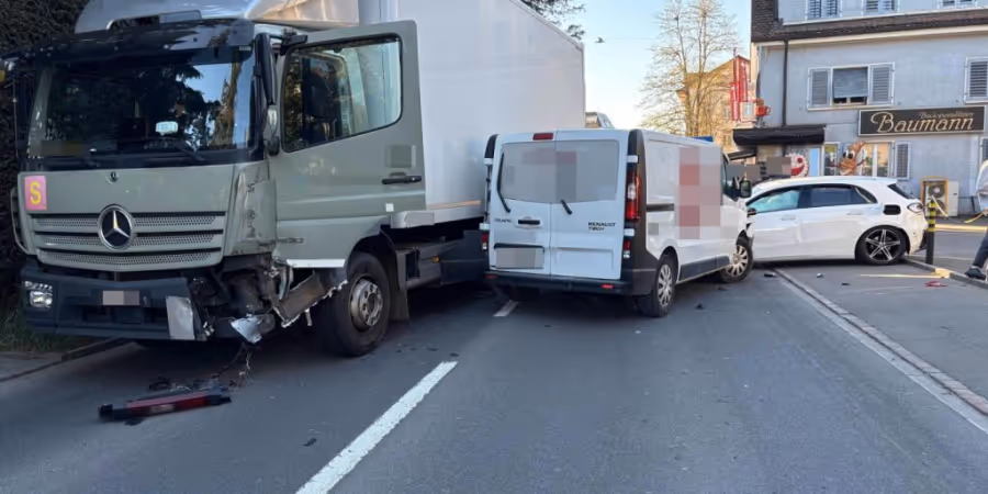 Der Unfall ereignete sich kurz vor 18 Uhr auf der Hauptstrasse in Reinach, wie die Kantonspolizei Aargau am Donnerstag mitteilte. Der 27-jährige Lastwagenfahrer sei mit seinem 14 Tonnen schweren Fahrzeug Richtung Menziken gefahren und aus noch unbekannten Gründen auf der Gegenfahrbahn in die Autos geprallt, die vor einem Rotlicht standen.