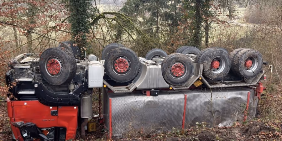 Bei einem Unfall ist ein Lastwagen am Freitagmorgen in Hallau eine Böschung hinuntergestürzt. Der LKW überschlug sich und blieb auf dem Dach liegen. Der Fahrer blieb unverletzt.