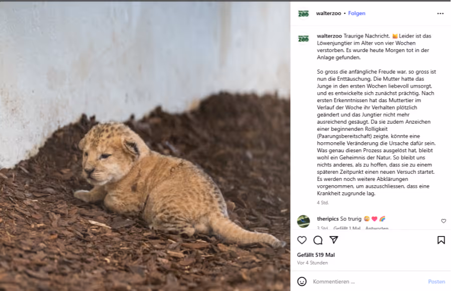 Der Anfang Oktober im Walter Zoo im sanktgallischen Gossau geborene Löwe ist tot. Das teilte der Zoo am Donnerstagabend auf Facebook mit. Es sei am Morgen leblos in der Anlage gefunden worden.