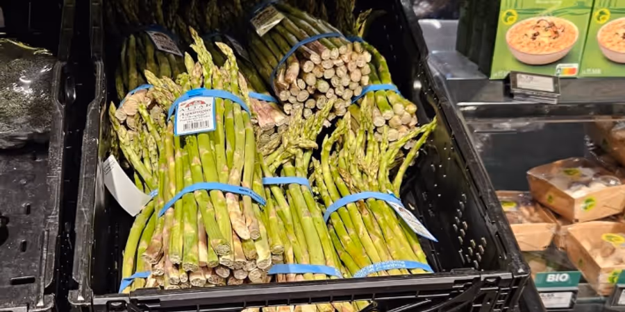 Ab Mitte beziehungsweise Ende April bezieht die Migros die Spargeln aus der Schweiz. Laut Prisca Huguenin-dit-Lenoir deckt die Schweizer Spargelproduktion jedoch nur etwa fünf Prozent der Nachfrage.
