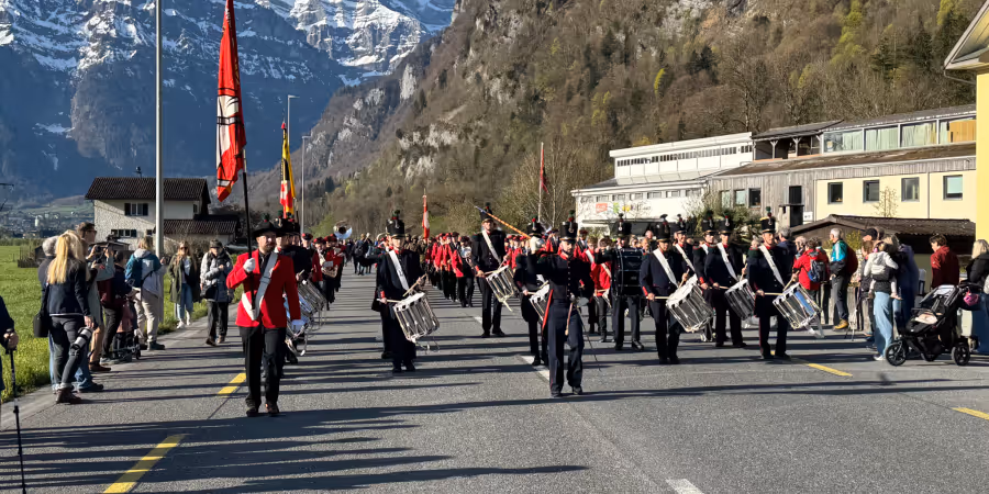 Schon um Viertel nach sieben am Morgen geht es beim Zeughaus Glarus los. Begleitet von einer militärischen Ehrenformation und der Harmoniemusik Glarus zogen dieses Jahr mehrere hundert Teilnehmer zu Fuss nach Näfels.