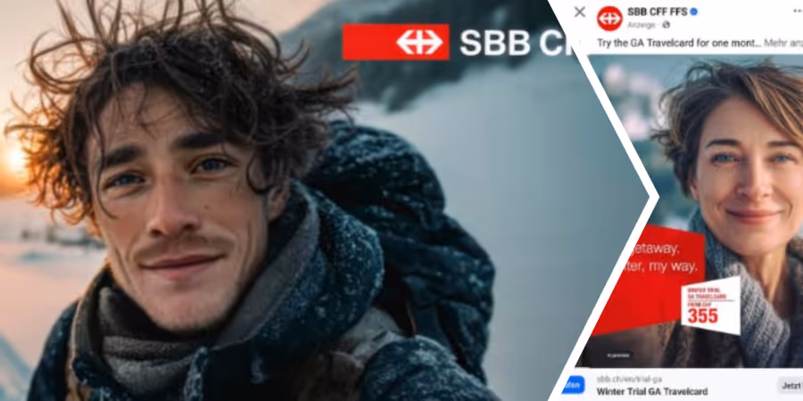 Zur Frage nach der Wirkung auf das Markenbild äussert sich die SBB in ihrer Antwort nur indirekt. Sie verweist auf einen verantwortungsvollen Einsatz. Gleichzeitig hält sie am Mix aus KI-Inhalt und klassischer Fotografie fest.