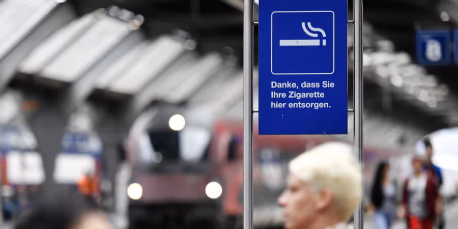 Eigentlich sind Schweizer Bahnhöfe seit fünf Jahren grundsätzlich rauchfrei. Damit Raucher vor dem Einsteigen aber doch noch die Nerven beruhigen können, gibt es Raucher-Zonen auf den Perrons.