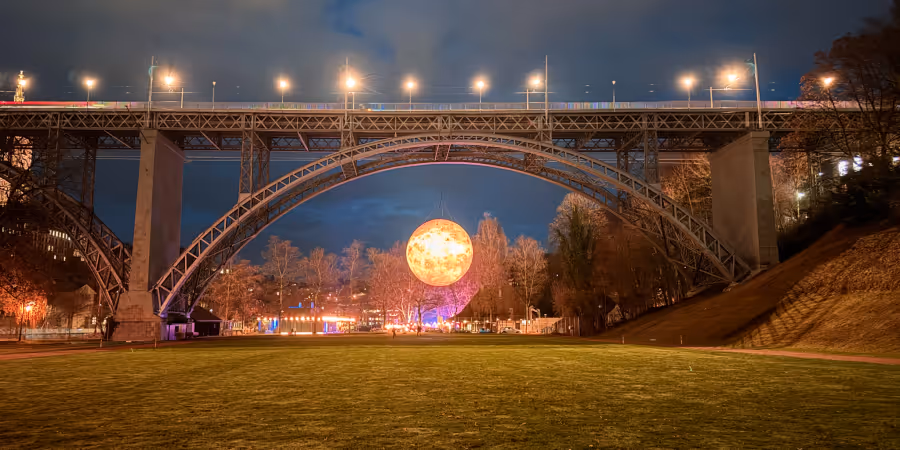 Bei genauem Hinschauen erkennt man jedoch, dass es sich nicht um den Mond, sondern um die Venus handelt. Die Lichtkugel hängt an Seilen befestigt unter der Brücke im Schwellenmätteli.