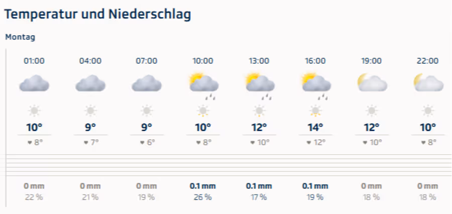 Für den Montag werden derzeit (Stand: Mittwochnachmittag) Temperaturen von 8 bis 14 Grad vorhergesagt. Zu Beginn des Morgenstreichs soll es derweil trocken bleiben bei neun Grad.