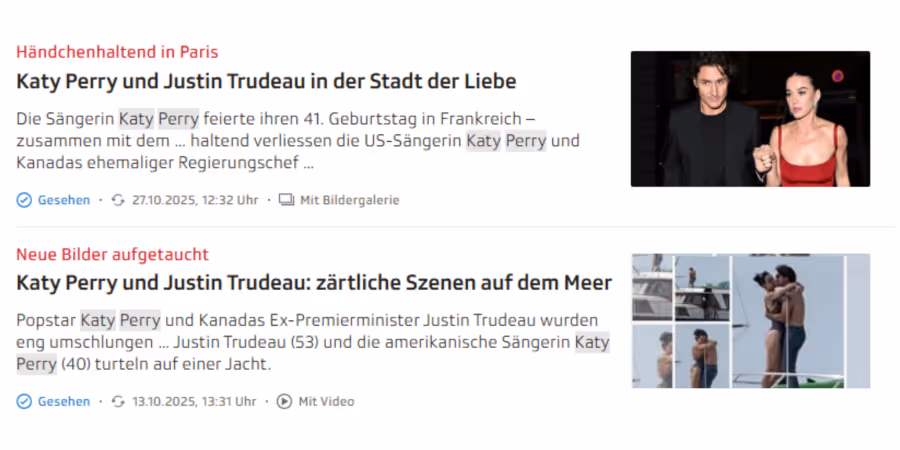 Vor allem Katy Perry scheint es der Redaktion am Leutschenbach angetan zu haben: Gleich zweimal berichtet SRF über ihre Turteleien mit Trudeau und zeigt dabei intime Paparazzi-Aufnahmen. Und das ohne Bezug zu einer Radio- oder Fernsehsendung.