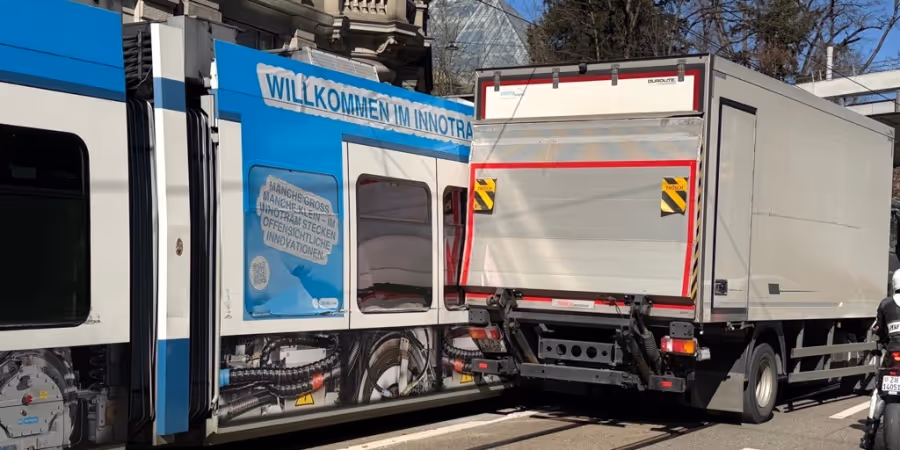 In Zürich kam es am Freitagnachmittag zu einer Streifkollision zwischen einem Lastwagen und einem Tram. Zahlreiche Scheiben gingen zu Bruch.