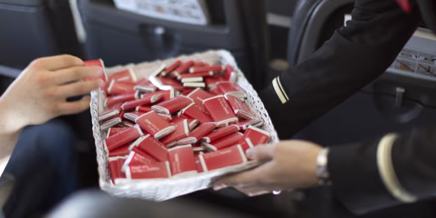 Die kleine Schoggi ist ein Markenzeichen von SWISS und steht symbolisch für die Schweizer Gastfreundschaft. Denn täglich werden über 50'000 Schöggeli an Bord verteilt.