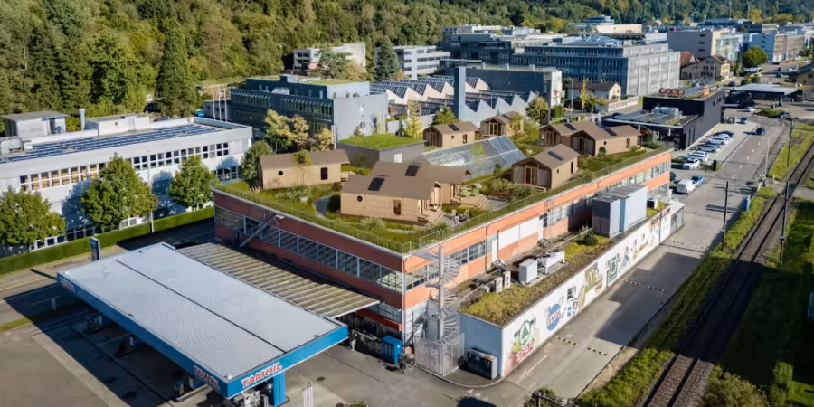 Ein neues Projekt in Dättwil, das zu Baden gehört, will nun ungenutzte Flächen erschliessen: Auf dem Flachdach eines Gewerbegebäudes sollen mehrere kleine Holzhäuser entstehen.