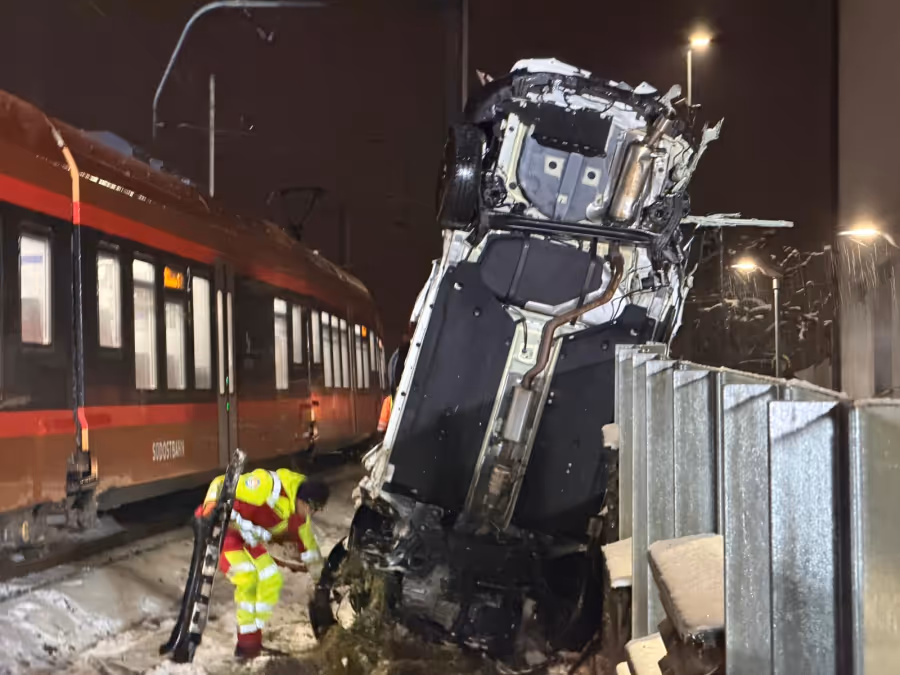 Zahlreiche Blaulichtorganisationen sind vor Ort, unter anderem rund 25 Feuerwehrleute. Das Auto musste mit einem Schienenkran geborgen werden. Laut einem Mediensprecher der Polizei gab es keine Verletzten.
