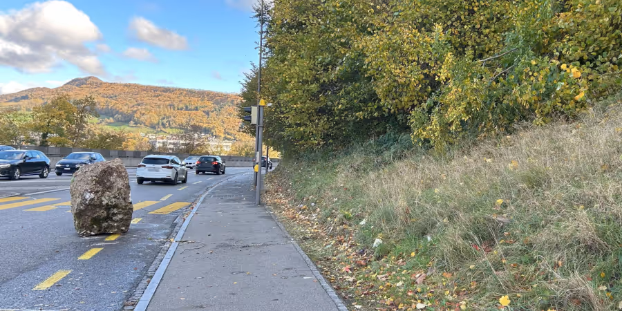 Von einer Scharte am Martinsberg in Baden brach kurz vor 17 Uhr ein Felsbrocken ab. Der rund zweieinhalb Tonnen schwere Stein rollte den Hang hinunter und landete auf der Bruggerstrasse.