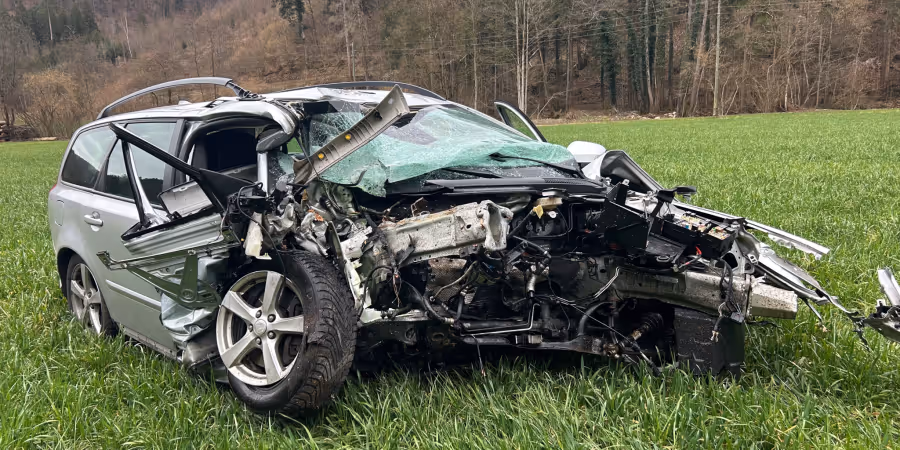 Rettungsdienst und Polizei trafen vor Ort auf einen stark deformierten Volvo. Das Fahrzeug war von der Strasse abgekommen, gegen einen Baum geprallt und kam folglich in einer Wiese zum Stillstand.