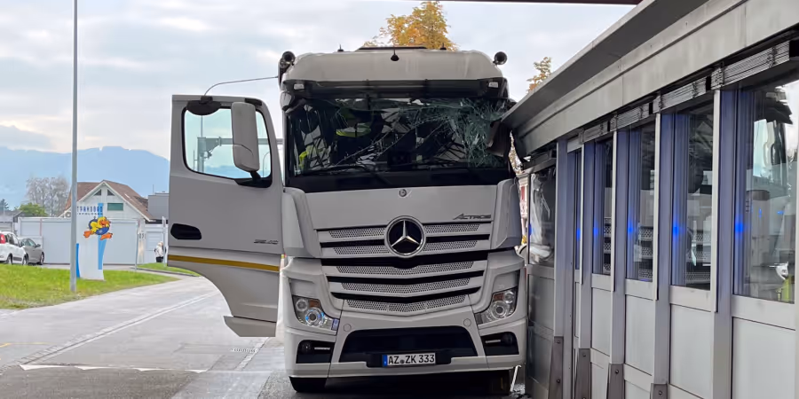 Als er den Grenzübergang passieren wollte, prallte er mit der Fahrerkabine in das Zollhaus. Der Fahrer hatte mutmasslich ein medizinisches Problem. Er wurde von der Rettung ins Spital gebracht.