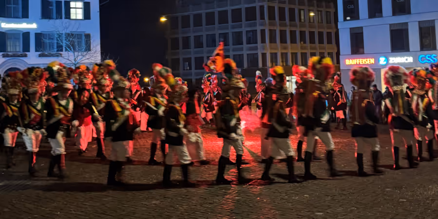 Auch die Trompeten und Pauken der Guggemenmusik Räbafäger schmettern und krachen noch einmal und erfüllen die Gassen ein letztes Mal mit lautstarker Fasnachtslaune.