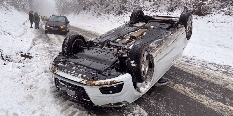 Auf verschneiter Fahrbahn bei Rümikon AG geriet ein Wagen bei einem Ausweichmanöver ins Rutschen und überschlug sich. Verletzt wurde niemand.
