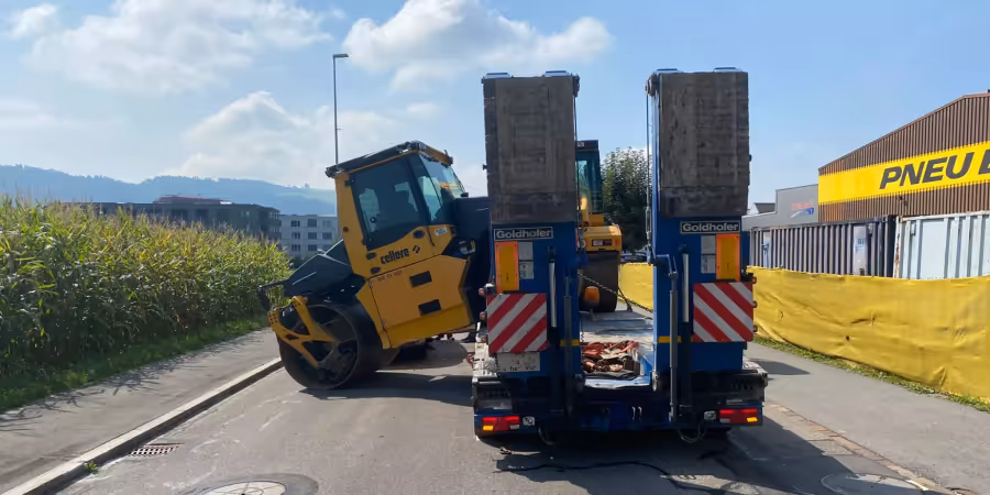 Am Freitagmittag, 11. September, kurz vor 12:15 Uhr, ist auf der Birkenstrasse in Rotkreuz ZG eine Strassenwalze ab einem fahrenden Lastwagen auf die Strasse