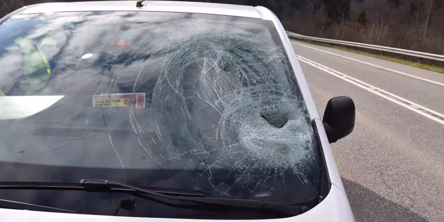 Am Montag, 23. März, sind von einem Anhängerzug Eisplatten auf einen Lieferwagen heruntergefallen. Die Frontscheibe wurde komplett beschädigt.