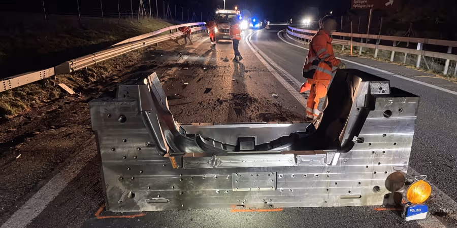 Das zwölf Tonnen schwere Stahlelement, ein Pressstück für die Stossstangenanfertigung von Fahrzeugen, sowie das Fahrzeug beschädigten die Nationalstrasse stark.