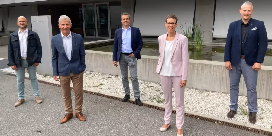 Der neu gewählte Ebikoner Gemeinderat: Andreas Michel (parteilos, Ressort Bildung), Mark Pfyffer (FDP, Ressort Gesellschaft & Soziales), Daniel Gasser (CVP, Parteipräsident), Susanne Troesch-Portmann (CVP, Ressort Finanzen) und Hans Peter Bienz (parteilos, Ressort Planung & Bau) (v.l.n.r). - Gemeinde Ebikon