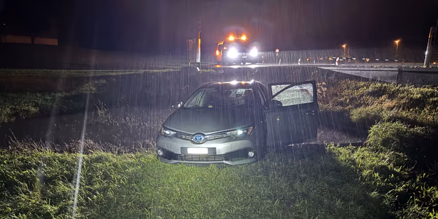 In der Nacht auf Sonntag verlor ein Autofahrer auf der Schwärzistrasse in Mollis GL wegen des Unwetters die Orientierung und fuhr in einen Bach.