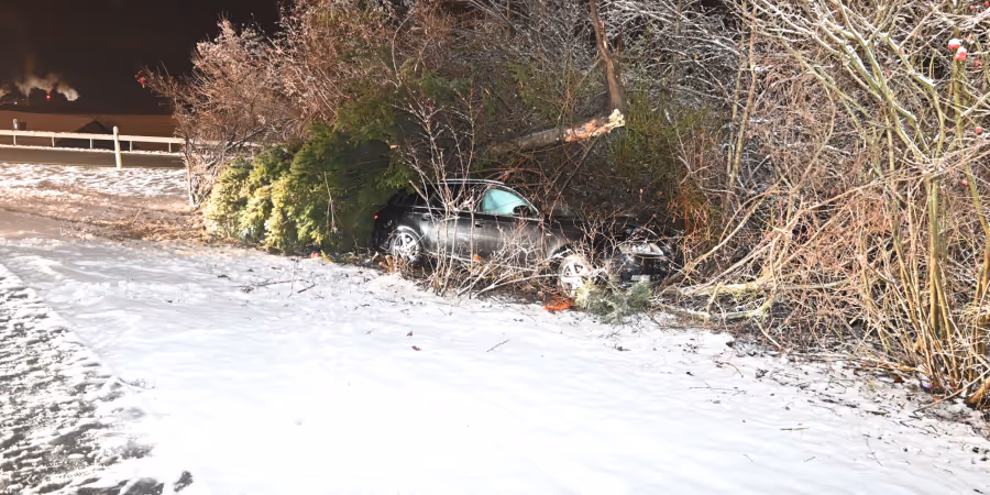 Dort prallte es frontal in einen Baum, welcher durch die Wucht des Aufpralls umstürzte, und kam in einer Hecke zum Stillstand.