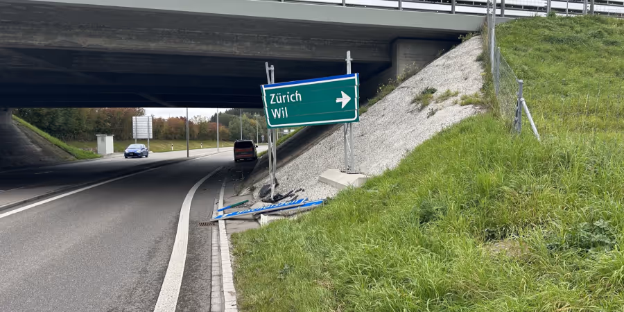 Kurz nach 12.30 Uhr meldete sich eine Auskunftsperson bei der Notruf- und Einsatzleitzentrale St. Gallen und meldete, dass unter der Autobahnbrücke diverse Teile der Verkehrssignalisation liegen.