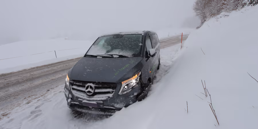 Auf der teilweise mit Schnee bedeckten Strasse geriet das Fahrzeug ins Schlittern, über die Gegenfahrbahn und kollidierte dort mit einer Mauer. Verletzt wurde niemand. Der dunkle Lieferwagen wurde an der Fahrzeugfront stark beschädigt. Die Polizei sucht nun Zeugen und besonders den Lenker des rot-braunen Autos.