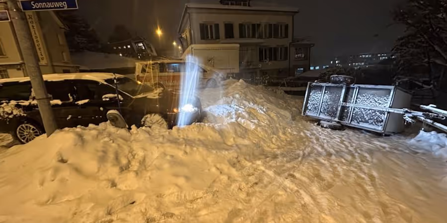 Durch die Kollision kippte der Anhänger und landete auf dem Sonnauweg. Personen wurden nicht verletzt, es entstand Sachschaden vom mehreren Tausend Franken.