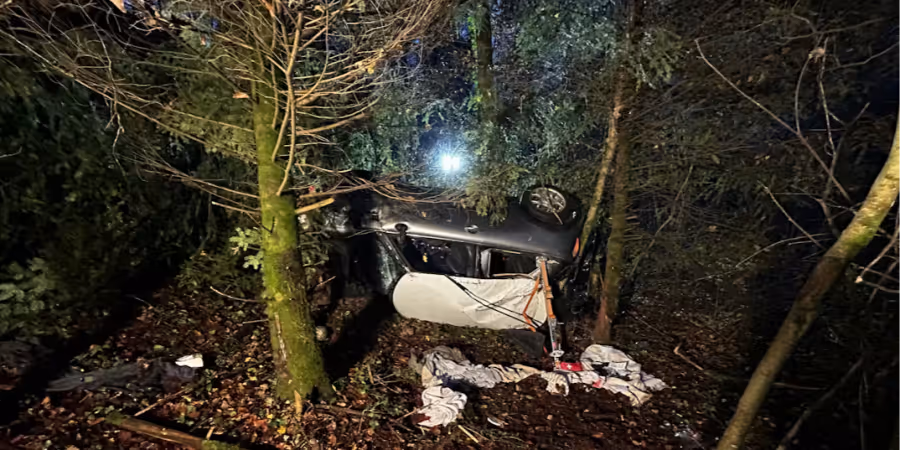 Das Auto überschlug sich in der Folge und kam anschliessend im angrenzenden Waldstück auf dem Dach liegend zum Stillstand.