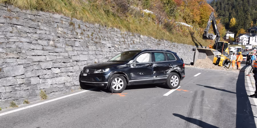 Der Dumper kippte auf die linke Seite und der Bauarbeiter fiel auf die Strasse. Das Auto kollidierte mehrmals mit der Leitplanke und kam an der gegenüberliegenden Stützmauer zum Stillstand. Der Zustand des Bauarbeiters verschlechterte sich zusehends, wonach ein Team der Rettung Surselva aufgeboten wurde.