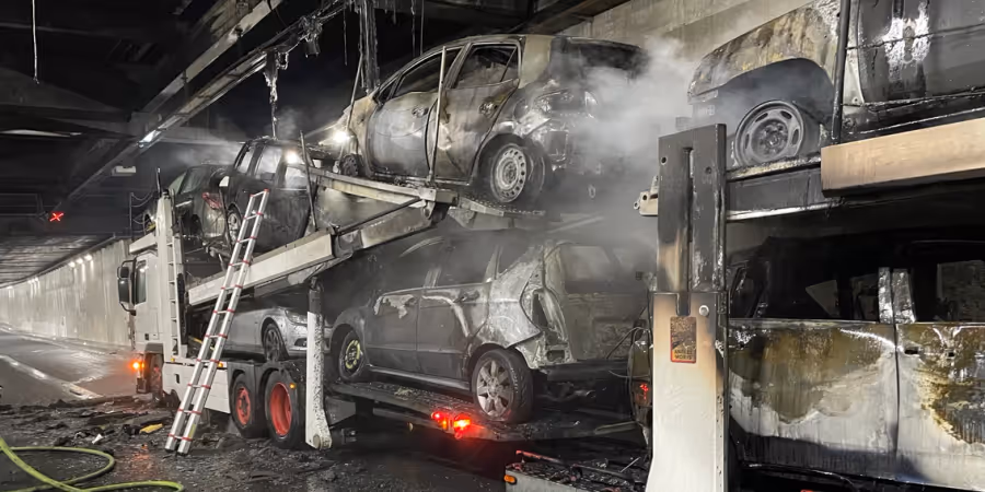 Eingangs Sonnenbergtunnel stoppte er das Fahrzeug. Dabei stellte er offene Flammen fest. Das Feuer breitete sich schnell auch auf die geladenen Autos aus.
