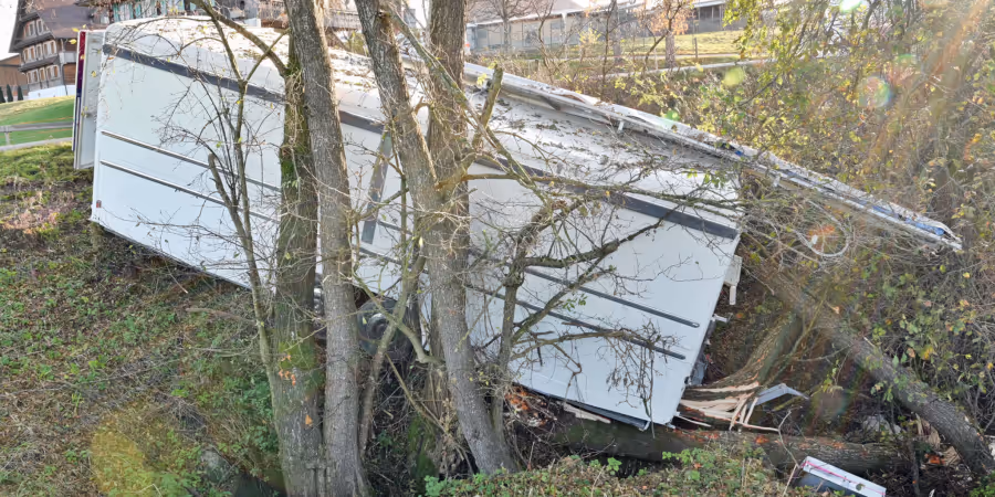 Dieser rollte anschliessend von der Strasse ins rechtsseitige Wiesland, durchbrach einen Zaun und kam in einem Bachbett zum Stillstand. Verletzt wurde niemand.