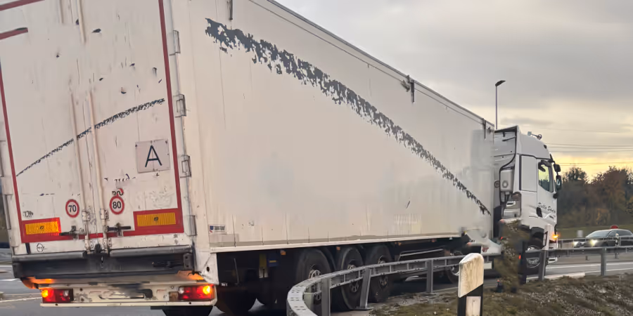 Ein 44-jähriger rumänischer Chauffeur kollidierte beim Einfahren mit seiner Fahrzeugkombination mit der Leitplanke. Das Fahrzeug verkeilte sich und blieb stecken. Verletzt wurde niemand.