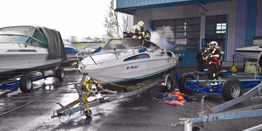 Das Boot befand sich deshalb auf einem fahrbaren Gestell auf einem Firmenareal. Aus zurzeit noch unbekannten Gründen geriet der Motor des Boots in Brand.