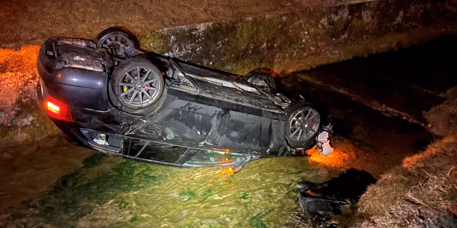 Ein Autofahrer war kurz in der Nacht zum Sonntag, 27. Februar 2022, vor 2.45 Uhr auf der Dorfstrasse in Richtung Schönenberg unterwegs. Kurz vor dem Dorfausgang kam das Fahrzeug rechts von der Strasse ab, überschlug sich und kam auf dem Dach liegend im angrenzenden Bach zum Stillstand.