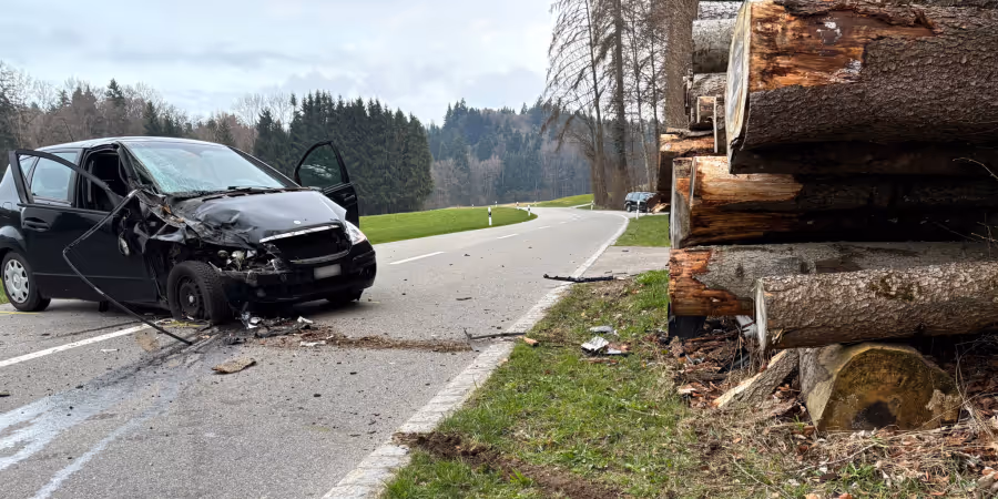 Kurz vor 18 Uhr fuhr ein 72-jähriger Autofahrer auf der Rüetschbergstrasse von Ettenhausen in Richtung Rüetschberg. Bei einem Waldstück nach der Verzweigung mit der Strasse «Iltischhuuse» kam das Auto rechtsseitig von der Strasse ab und kollidierte mit einem Randleitpfosten sowie einem Stapel von Baumstämmen.