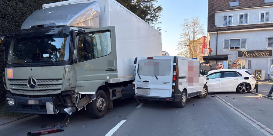 Ein Lenker geriet in Reinach AG mit seinem Lastwagen auf die Gegenfahrbahn und prallte dort in vier Autos, die vor einem Rotlicht standen.