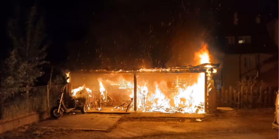 Trotz raschem Löscheinsatz durch Angehörige der Feuerwehr Dornach wurden sowohl der Unterstand wie auch die darin abgestellten Fahrräder und diverse andere Gerätschaften komplett zerstört.