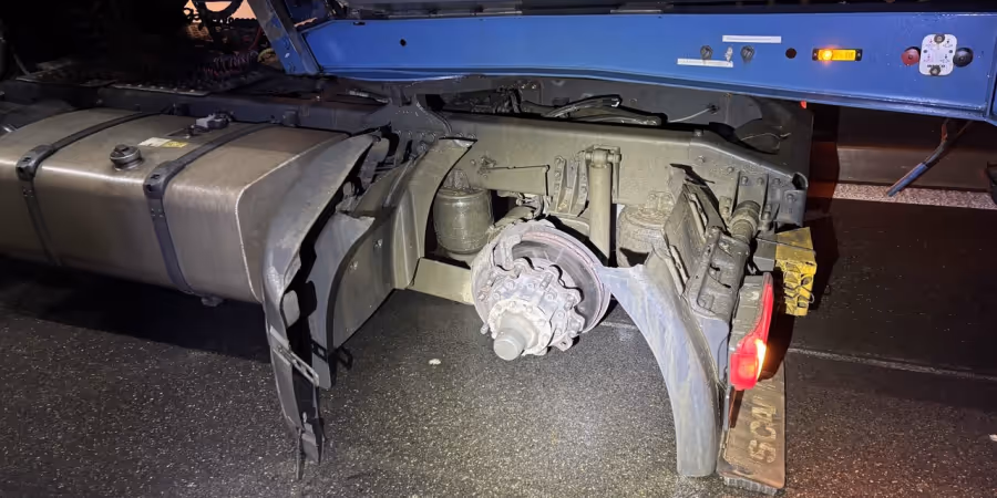 Ein Komplettreifen rollte auf die Gegenfahrbahn, touchierte die Tunnelwand und blieb nach zirka 50 Meter stehen. Der zweite Komplettreifen kam erst nach zirka 200 Meter zum Stillstand.