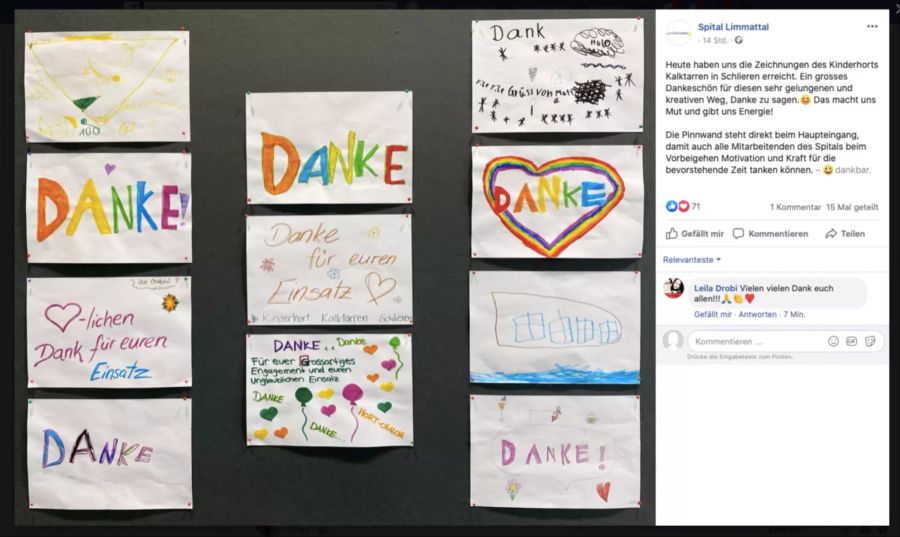 Der Kalktarren-Hort ist nur fünf Gehminuten vom Spital Limmattal entfernt und kümmert sich um viele Kinder von Eltern, die dort in der Pflege arbeiten. «Wir fragten die Kinder, wie wir helfen wollen und haben uns dann gemeinsam entschieden Dankeszeichnungen zu machen. Die Reaktion des Spitals ist total schön und hat uns natürlich sehr gefreut», sagt Minela Sopi.